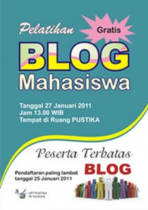 UPT Pusat Informatika akan menggelar Pelatihan Blog Mahasiswa, yang akan diadakan di Lab Multimedia Pustika ISI Surakarta, pada hari Kamis 27 Januari 2011 jam 13.oo wib s.d. selesai. Pelatihan diberikan secara gratis kepada mahasiswa.