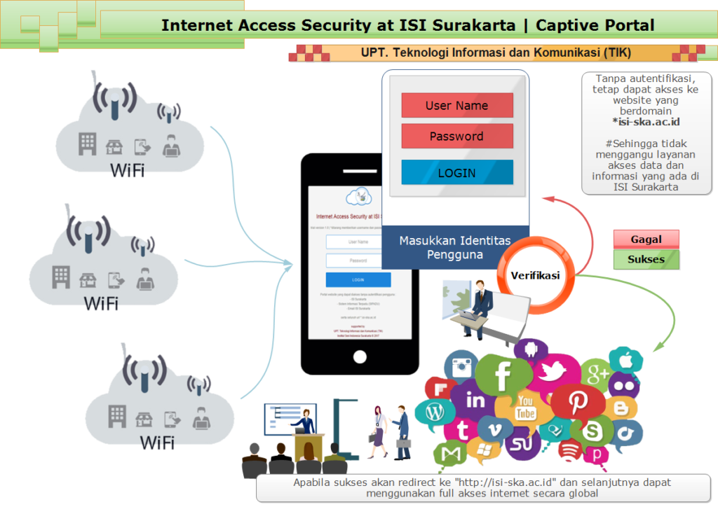 Apa itu Portal Login Akses Internet??merupakan parameter autentifikasi dengan user dan password yang telah ditetapkan bagi sivitas akademika ISI Surakarta yang akan menggunakan fasilitas wireless hotspot/Wi-Fi di lingkungan kampus. Pada awal ujicoba ini user/password masih bersifat global bagi pengguna (1 akun digunakan bersama-sama), namun secara periodik password secara random akan berganti-ganti. Sehingga diharapkan bagi sivitas selalu update informasi mengenai user/password akses internet melalui portal SIPADU (dengan akun masing-masing) SIPADU | SIAMA – DOSEN – STAF.